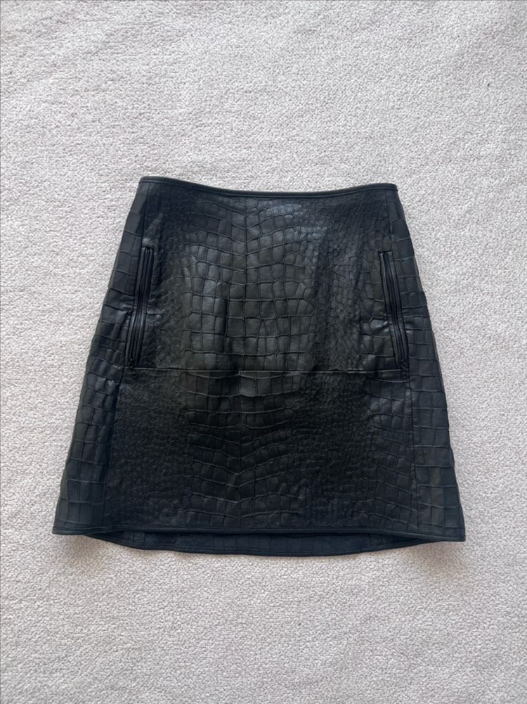 아크네 스튜디오 양가죽 미디 스커트입니다. 독특한 질감의 블랙 컬러 좋은 퀄리티의 가죽이 눈에 띄네요.문의 없으시면 바로 안전결제해주시면 됩니다! 총장 45cm 허리 34cm