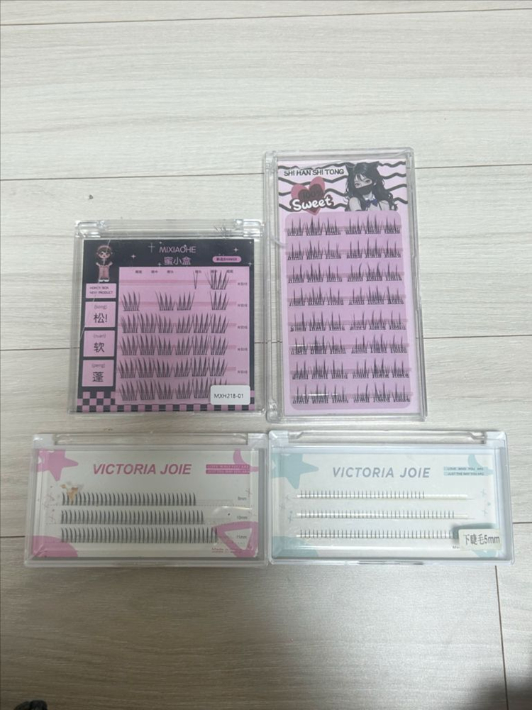 위에 두개는 테무에서 구매한 노글루 속눈썹이고 밑에 두개는 에이블리 가닥속눈썹 언더속눈썹 입니다 케이스는 살짝 깨진것도 있지만 속눈썹은 보시다시피 거의 사용 안했고 문제 없습니다 낱개 구매도 가능하지만 일괄 다 가져가실 분 선호합니다! 교환,환불,취소 안돼요 Cu끼리택배 +2000 Gs반값택배 +2000 일반택배 +4000 우체국택배 +5000