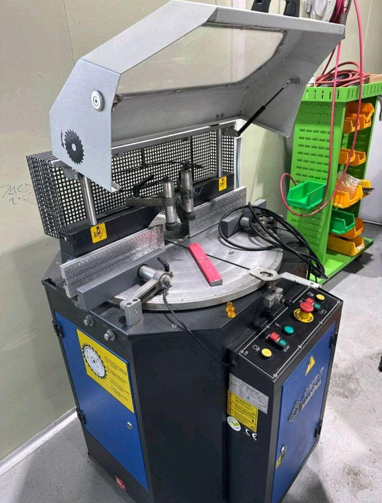 *톱날 이송방식 - 유공압식, 더블 칼럼 가이드 적용 *절단 가능 소재-알루미늄, 프로파일, 구리, 플라스틱류 *절단 가능 각도- 각도 무제한 *전기 - 1.5kW, 380V 3P *사용 공기압력 - 6~8Bar *톱날 회전속도 - 3000RPM *톱날 규격 : 외경*내경*두께 = 450*30mm *기계 크기 - 정면*측면*높이 = 850*900*1380mm *원형 테이블 직경 - 730mm *바닥에서부터 테이블까지의 높이 = 996mm *기계 무게 - 236k 성능, 기능 이상무 입니다. LED등이 장착되어 작업이 편리합니다 양쪽 롤러대는 각각 3미터씩 있습니다.
