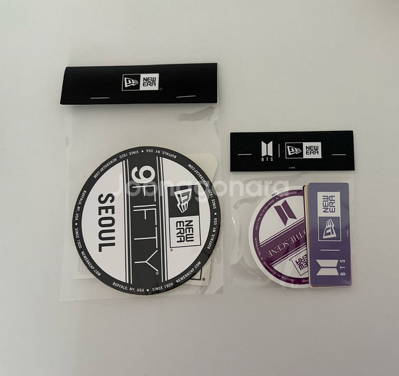 뉴에라 데칼 스티커 세트 정품입니다. 패션/ 캐리어/ 캠핑 등 활용하기 좋습니다. 2가지 세트: 1) 실버 스티커 (사이즈 지름 9.5cm) 세트 2) 뉴에라 X BTS 콜라보 스티커 세트 총 11장 일괄 7000원입니다. 낙성대 직거래 택배, 반값 모두 가능해요.