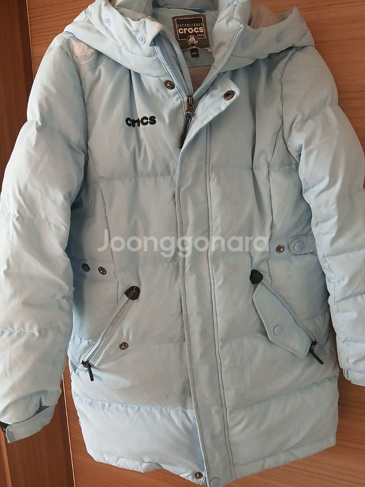 크록스 브랜드의 여성용 패딩점퍼예요. 라이트 블루 컬러에 후드가 있고 지퍼로 여밈이 가능해서 실용적이에요. 전체적으로 깔끔한 상태로 보관되어 있습니다.