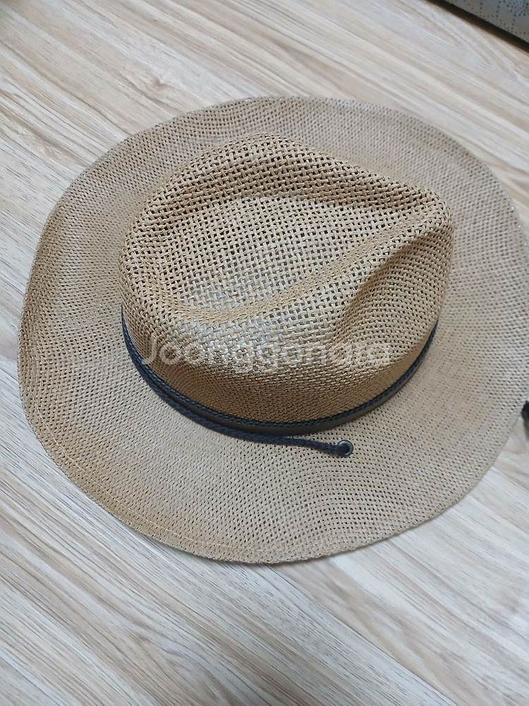 남성용 모자예요. 베이지 컬러에 브라운 밴딩으로 포인트를 준 깔끔한 디자인이에요. 상태 양호하고 착용하기 좋을 것 같아요.