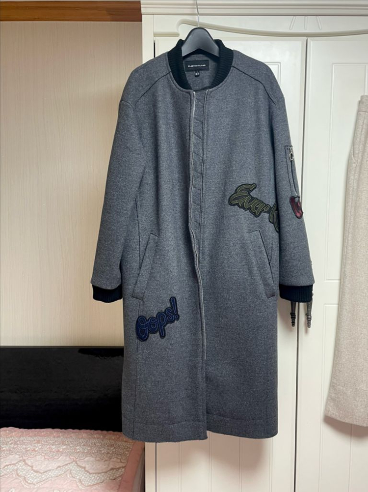 구매 후 2-3 회착용 상태 깨끗합니다! 캐쥬얼하게 툭 걸쳐입기 좋아요! 총장 104cm 폴리에스터 50% , 울 50% 누빔 안감