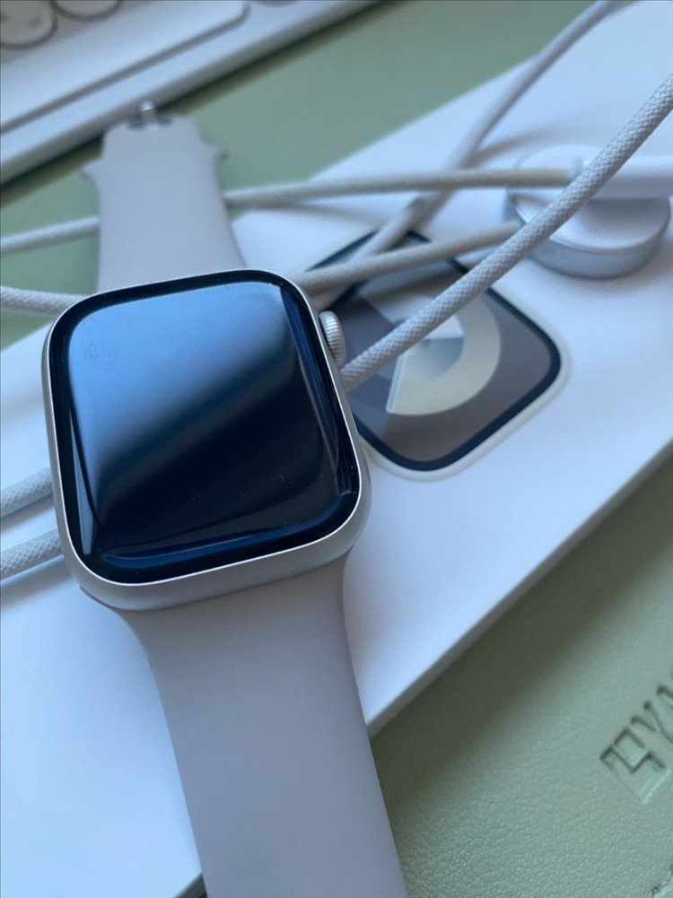 애플워치 시리즈 9 41mm GPS 스타라이트 알류미늄 관리를 잘하고 아껴 쓰던 애플워치와 아쉽게도 헤어질 때가 왔습니다. 새 제품은 아니지만 눈에 띄는 기스가 없고, 눈에 보이는 건 크라운에 살짝 찌그러진 부분이 있습니다. 베터리 효율 89%입니다 스트랩(M/L), 충전코드, 박스를 같이 드립니다. 직거래만 회기역 1번출구, 외대역 1번출구