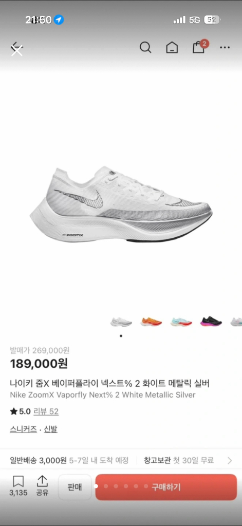 나이키 줌X 베이퍼플라이 넥스트% 2 런닝화입니다 화이트/메탈릭 실버 색상이고요, 밑창에 사용감 조금 있습니다(사진 참고해주세요) - 반응성이 뛰어난 경량 폼 사용 - 풀-렝스 카본 섬유 플레이트로 추진력 강화 235 선물 받았는데 손이 안가서 판매합니다 3번정도 신었습니다 환불 X