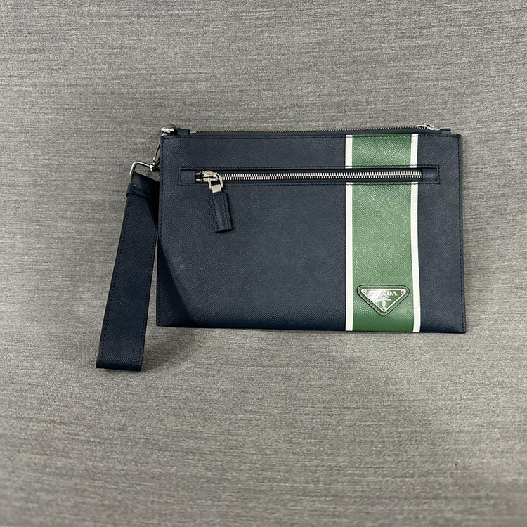 프라다 나일론 소재의 네이비와 그린 컬러 클러치백이에요. 내부는 깔끔한 블랙 컬러로 되어있고, 손잡이가 있어서 들고 다니기 편해요. 상태좋은 중고 제품입니다.