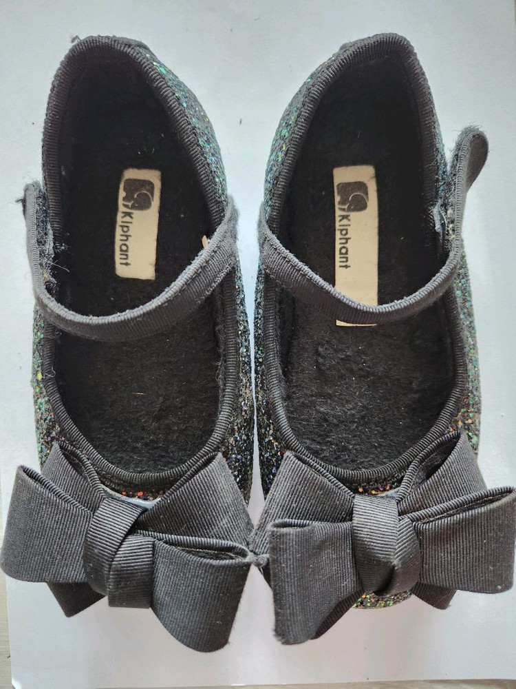 키펀트 여아 구두입니다 블랙 색상에 반짝이 재질로 되어있고, 리본 장식이 있습니다 앞쪽에 까임이 있습니다