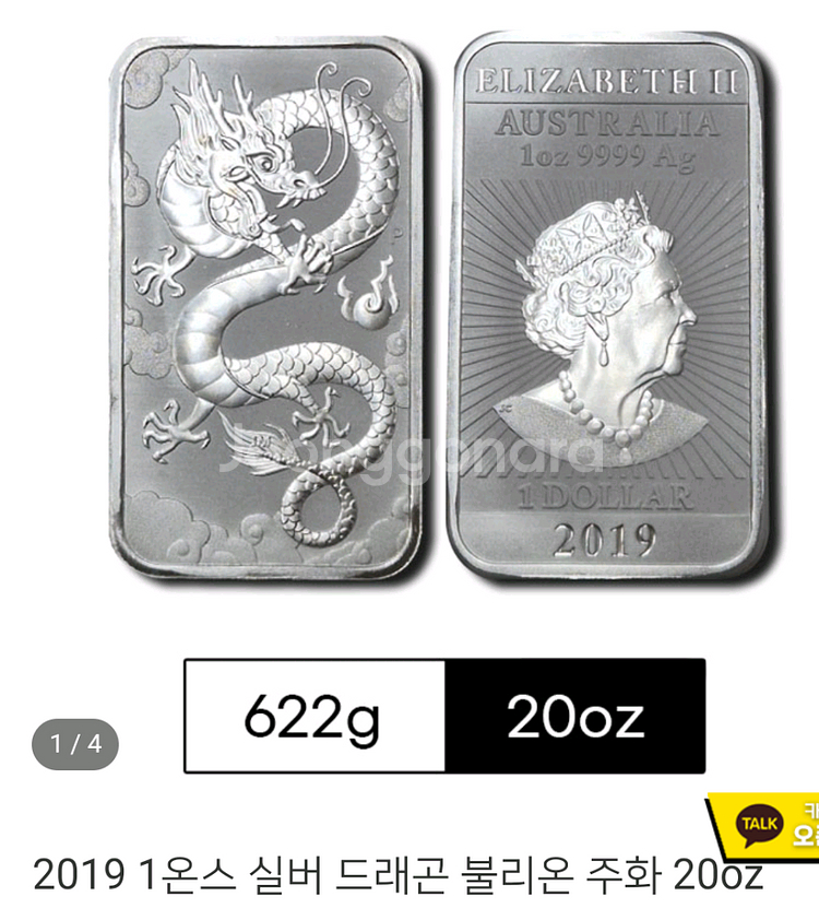 2019년 정품 드래곤 디자인 1온스 (31.1g)실버바예요.사각실버바20온스355만원에 판매 합니다ㆍ 변색 밀크스팟 없이 깔끔하게 보관되어 있어 상태가 매우 좋습니다. 서청주우체국안 현금거래할께요ㆍ당일시세 기준임니다ㆍ