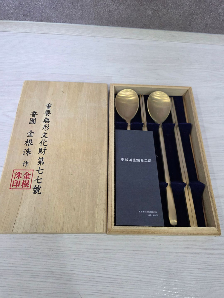 중요무형문화재 77호 안성유기 김수영 선생 작품 궁중 수저세트 2벌 판매합니다 중금속 등 안좋은 성분이 녹아나지 않아 건강 식기로 좋고 깨지지도 않아 오래 보관하실 수 있습니다 직거래 택배 모두 가능하고 수저 젓가락 길이는 약22cm 입니다