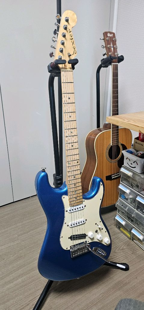 덱스터 슈퍼스트랫 일렉기타 국내제조 . 상태 깨끗합니다. . 암은 사이즈가 좀 작은게 체결되어있는데... 종이같은걸로 낑겨놓으면 사용에 문제 없습니더. . 인도네시아 중국 등 제조 아닙니다. 국내 제조품입니다. . 사양 검색해보시면 아시겠지만 입문기 이상은 되는 제품입니다. . 소케 포함.