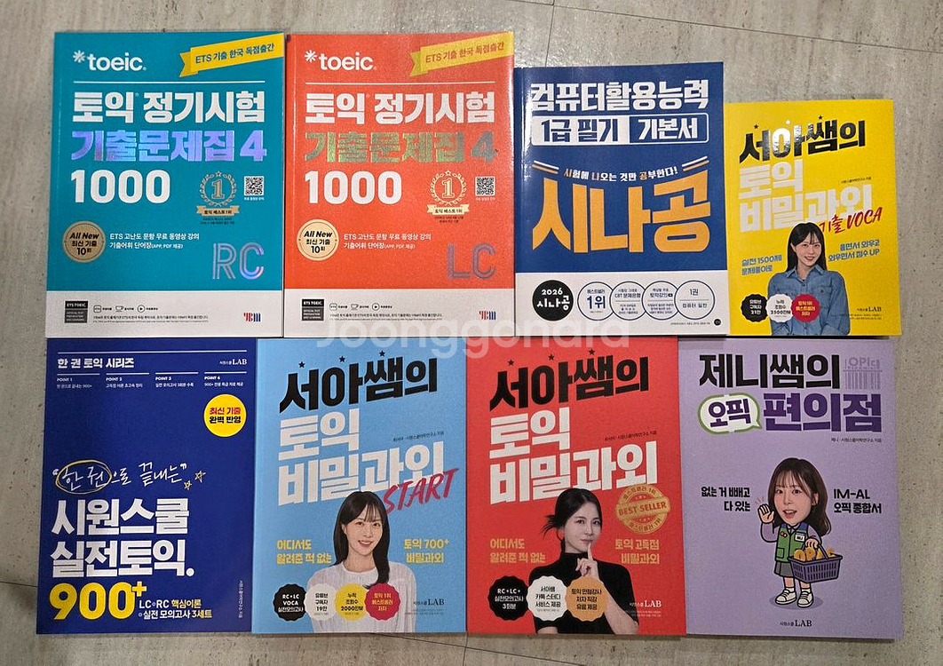 자격증 교재 팔아요. 펼쳐보기만 한 새 책들입니다. 반택포 금액이고, GS반값택배로 보내드려요. 010-사구사팔-7018로 연락주세요. 4. 시원스쿨 실전토익 900+ : 16,110원 >> 12,000원 8. 제니쌤의 오픽 편의점 +워크북(총 2권) : 17,820원 >> 12,000원