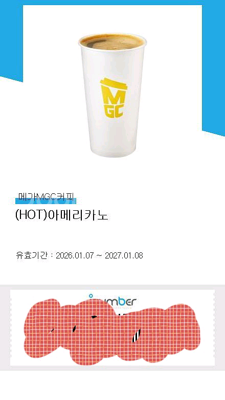 메가MGC커피 아메리카노 쿠폰이에요. 유효기간은 2026년 1월 7일부터 2027년 1월 8일까지입니다.