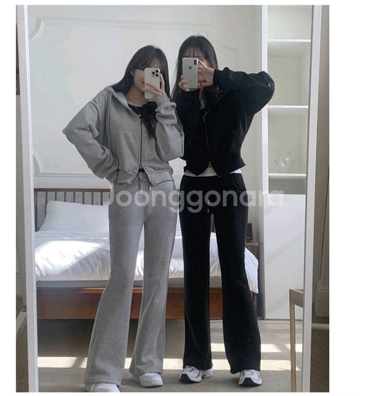 기모 안감으로 따뜻한 후드집업 트레이닝 셋업입니다. 부츠컷이라 다리가 길어보이는 효과가 있어요. 집업 Free 팬츠 long Color 블랙 연락주세요~