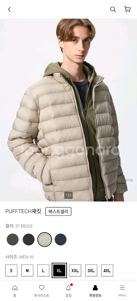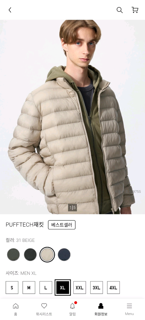 유니클로 퍼프텍 재킷 베이지 색상 남성 XL 사이즈 택없음 실착 1회