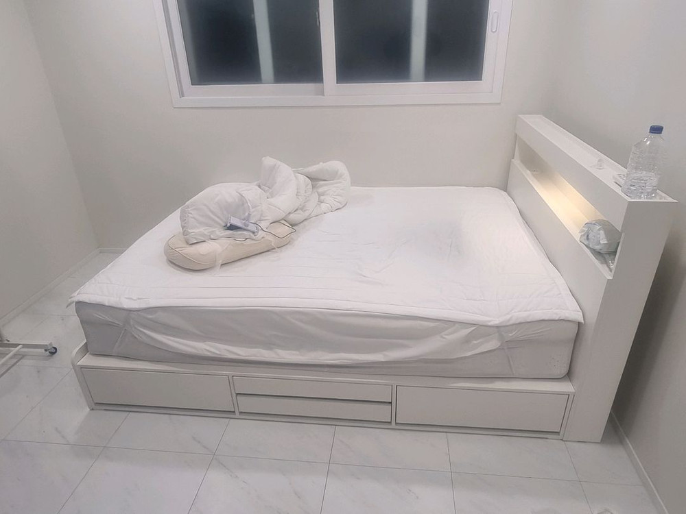 !!눕 이지 LED 조명 수납 침대 프레임 퀸!! 사이즈 판매합니다. 프레임 하단에 서랍형 수납공간이 있어 공간 활용에 유용합니다. 침대 헤드에 LED 조명이 은은하게 비춰 아늑한 분위기를 연출합니다. 눕 이지 LED 조명 4단 수납 침대 프레임 입니다 ❗️프레임만 30 넘게 줬지만 이사로 싸게 내놔요❗️ 오늘 저녁까지만 판매합니다 사이즈:퀸 사이즈 W:1520 D:2155 H:1000 색상:화이트 전기 콘센트:1구 USB 포트:1포트 LED 조명 조절 버튼(3단 밝기 조절) 사용은 얼마 안해서 전체적으로 새것 수준 입니다 하자가 딱 하나 있다면 콘센트 위쪽 사진에 잇듯이 표면제가(시트) 좀 벗겨진거 말고는 없습니다 그렇다고 보기에 안좋지도 않으며 사용하는데도 아무 지장도 없습니다 무려 4단 수납장 볼레일이라 아주 좋아요 직접 가져가셔야 합니다