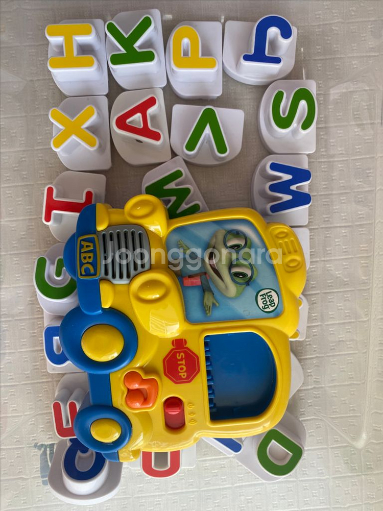 아이들 영어 학습용 교구예요. 알파벳 블록들과 버스 모양의 학습 장난감으로 구성되어 있어서 재미있게 영어를 배울 수 있어요. 알파벳다있어요