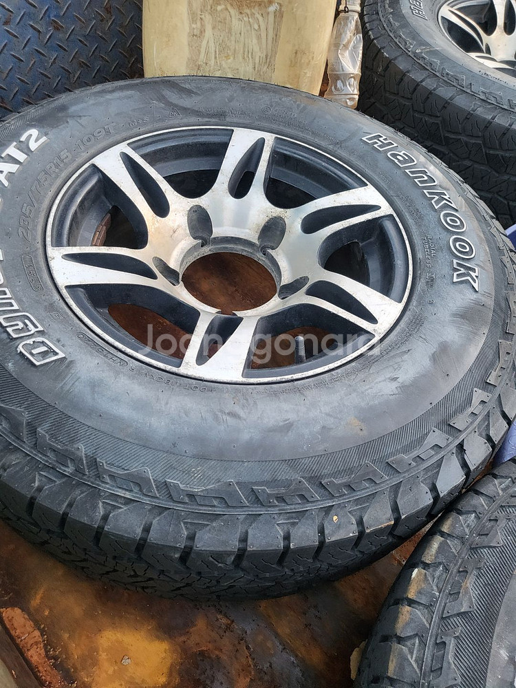 1톤4륜용 15인치 알로이 휠에 한국타이어가 장착된 세트입니다. 사용감은 있지만 상태 양호하고 바로 장착 가능해요. 실용적인 중고 타이어로 경제적입니다.70프로이상 휠캡없음 구육육일0808