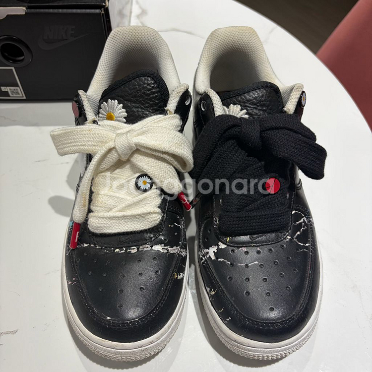 kkkkkkk 오프라인 매장에서 구입했습니다. 실착용은 2번이구요. 일하는 매장에 그대로 방치해서 뒷꿈치 안감부분이랑 흰색끈에 오염이 있구요. 끈은 새걸로 검정1, 흰색1 있습니다. 안에 속지는 좀 찢어졌네요. 크랙은 신어서는 거의 안생겼어요. 기본 구매했을 때 크랙이랑 비슷해요. 운동화에 끼워져있는 끈이랑 뒷꿈치 부분은 가벼운 세탁으로도 지워질것 같습니다. 사이즈 235이구요. 박스있어요.
