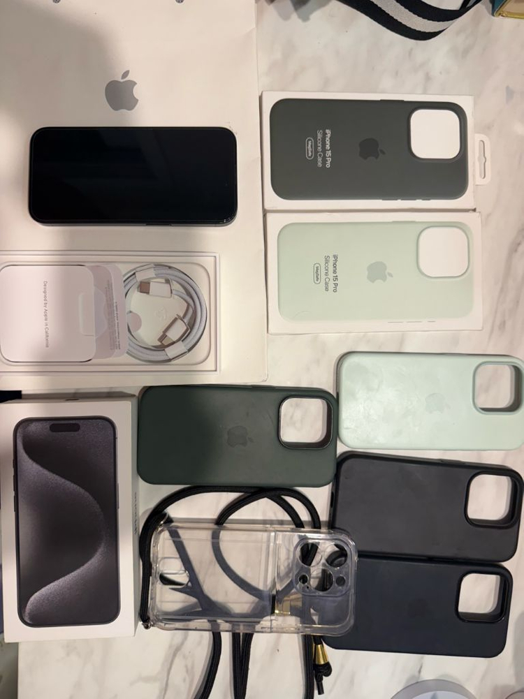 아이폰15프로 512 블랙 84% 풀박스 정품 케이스 사용한거 3개 그외 2개. 왼쪽 하단 약간찍힘 그외 상태 굿