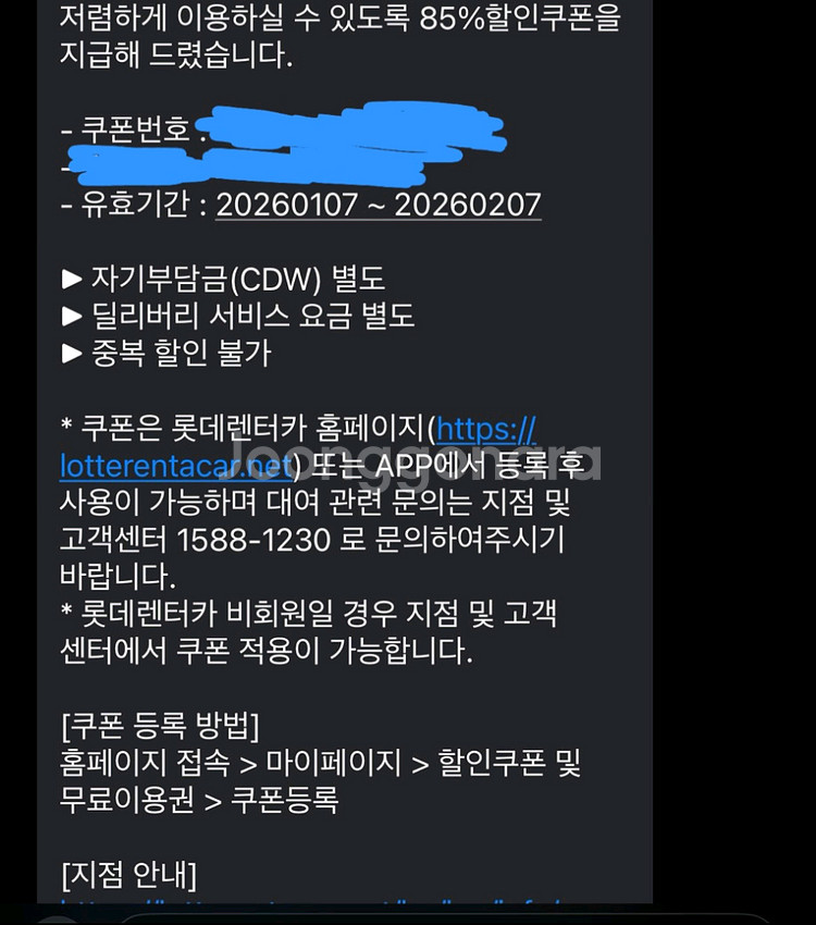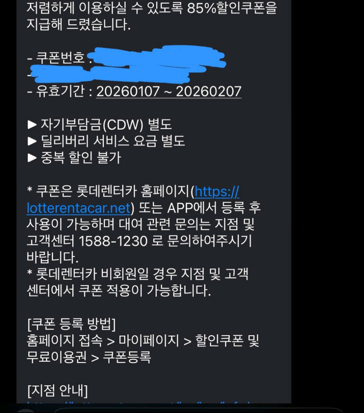 자동차렌트 85% 할인 쿠폰이에요. 2026년 2월 7일까지 이용가능합니다. 대여 시간 제한이 없어서 장기간 빌릴 경우 이득이에요