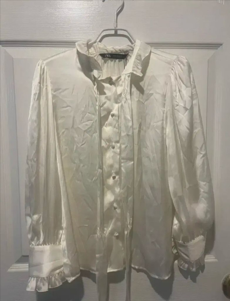 자라에서 나온 광택감 있는 블라우스입니다 예쁜데 사놓고 안 입었네요.. 반택 포함 가격입니다 필요하신 분 연락주세요 개인간 거래로 환불은 불가합니다