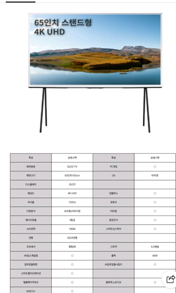 삼성 65인치 QLED 스탠드형 TV입니다. 깔끔한 화이트 프레임으로 인테리어에 잘 어울리고, 상태 양호해 보여요. 대화면으로 영화나 게임 감상하기 좋습니다. 07077212072