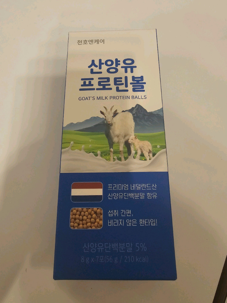 산양유 프로틴볼이에요. 단백질 5% 함유된 건강한 간식으로 새상품 미개봉 상태입니다. 아이들 간식이나 운동 후 보충용으로 좋아요!