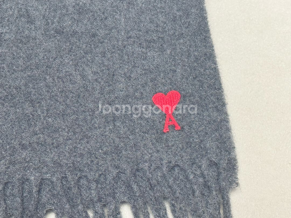 아미 머플러입니다. 회색 바탕에 빨간색 하트 로고가 포인트입니다. 2회 정도 착용했고 흠이나 얼룩 등 사용감 없습니다. 울 소재로 부드럽고 따뜻합니다. 모든 옷에 다 잘 어울려요😀