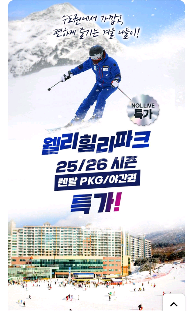 26년 웰리힐리 스키장 리프트+장비렌탈 반일권 이용기간 ~ 3/1 까지 종합매표소에서 교환 후 사용 대인 소인 주중 주말 구분 없음 5장 있습니다