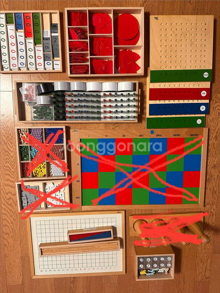 아가월드 몬테소리 수교구 (6-9세) 1. 짧은구슬사슬 20000 2.덧셈판, 뺄셈판 교구세트 10000 3.분수봉 판매완료 4.체커보드와 숫자타일 판매완료 5.색구슬바상자 판매완료 6.렉스앤튜브스 80000 7.분수상자 15000 8.은행놀이 10000 택배거래합니다. 단품거래 가능합니다 단품거래는 갯수에 따라 택배비 별도입니다 필요하신거 챗 주세요!