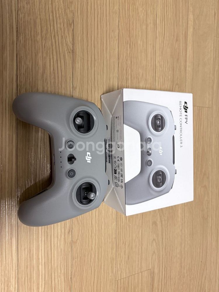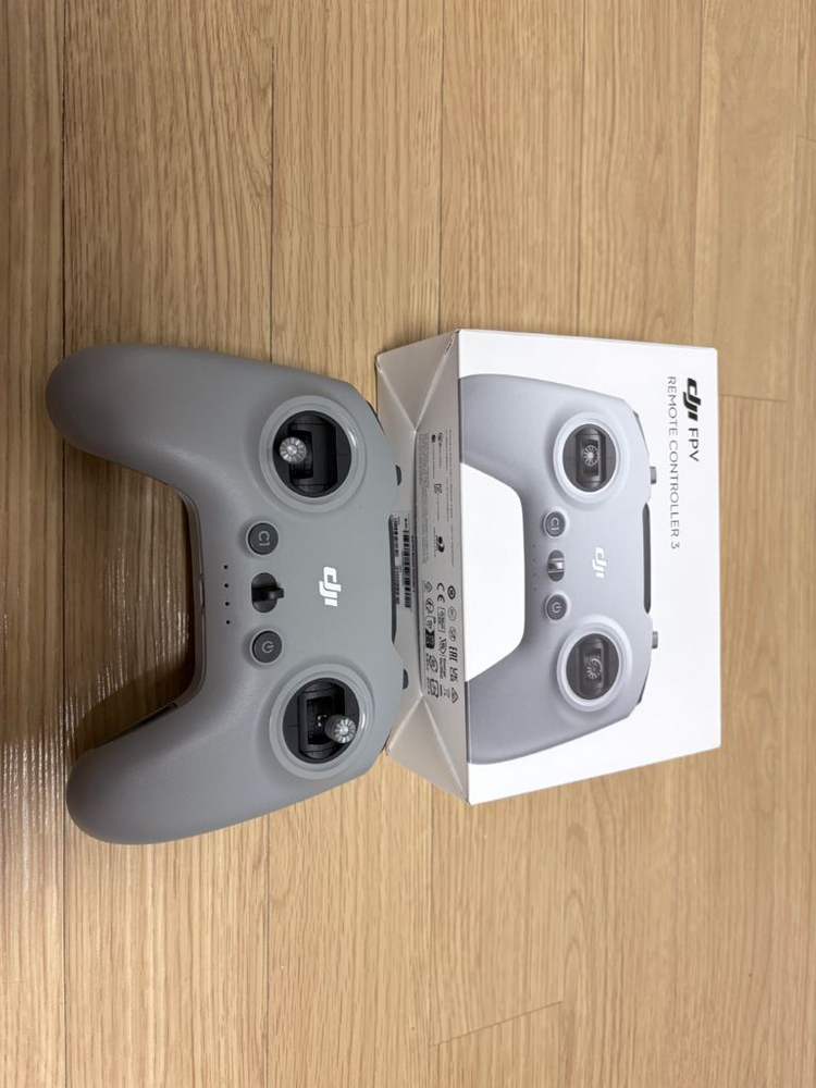 DJI FPV 고글과 조종기가 함께 있는 세트입니다. 박스도 포함되어 있고 상태가 깔끔해 보여요. FPV 드론 조종에 필요한 구성품이 모두 갖춰져 있습니다.