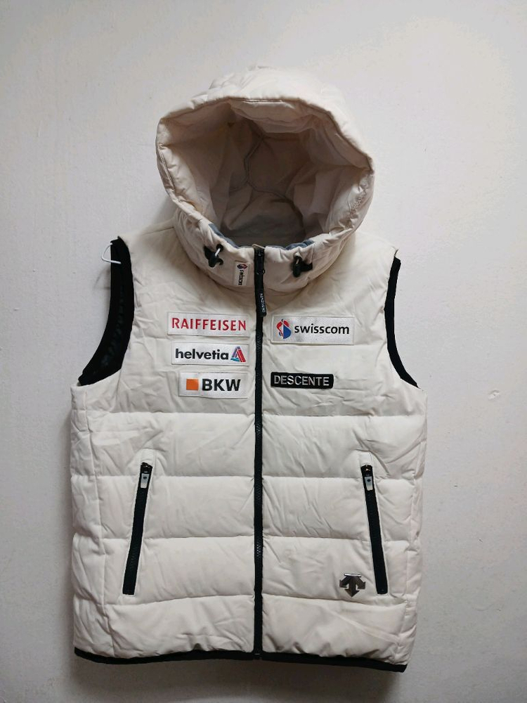 데상트 스키복 패딩 조끼 85사이즈입니다. 흰색 바탕에 스폰서 패치가 여러 개 붙어 있습니다. 모자 탈부착 가능하고, 상태 좋습니다. 충전재는 오리털 다운점퍼에요 상태 전체적으로 깨끗하고 하자 오염 등 없습니다 택배무료배송