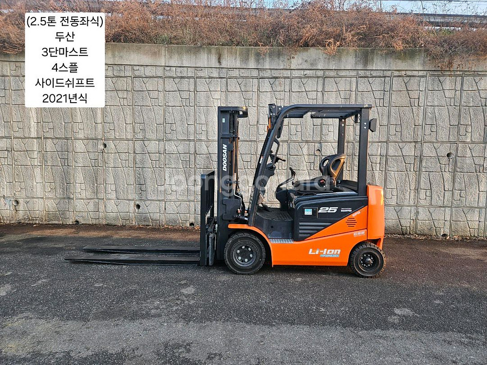 중고지게차 두산 B25NS 전동좌식 2.5톤 지게차 (3단, 4스플,사이드쉬프트) < 두산 B25NS > 제품명 : B25NS 제조사 : 두산 규 격 : 2.5톤 좌식형 전동지게차 옵 션 : 4스풀, 3단마스트, 사이드쉬프트 시 간 : 4,190HR 가 격 : 2,350 -> 1,950만원 (대폭 할인!!!) 년 식 : 2021년 배터리 : 리튬배터리 할인 행사로 신차와 같은 컨디션의 저렴한 가격의 특가상품을 소개해 드립니다. 21년식 두산 B25NS 2.5톤 좌식형 전동지게차 입니다. 기능상으로는 현재까지 신차 컨디션 유지중입니다. 신차를 구매하고 싶은데 금액이 고민이신 분께 적극 추천드리는 장비입니다. 직접 보시면 아주 만족하실겁니다. 본 장비 특장점은 아래글을 참조하여 주시기 바랍니다. { 특장점 } ☆ 빠른 주행 및 마스트 상,하강 속도 ☆ 저중심/안전성 증대 설계를 통한 적재능력 ☆ 전자식 브레이크 (EFB) ☆ 고성능, 고효율 Curtis AC 컨트롤러 (IP67등급) ☆ 높은 방수/방진 등급의 고품질 주행/유압모터 (IP54등급) ☆ 방수옵션(틸트 실린더부츠/ 하부커버) ☆ 다양한 안전감지 장치(OSS, 안전밸트 인터락) ☆ 리튬 배터리 (옵션) ☆ 배터리 측면 인출 시스템 좋은 지게차로 보답드리겠습니다~ 궁금하신점 언제든 편하게 연락 주시고 방문하셔서 시운전도 해보시고 결정하세요~ 거리상 직접 방문이 어려우시면 동영상 시운전도 가능합니다~ 많은 문의 부탁드립니다~ 감사합니다