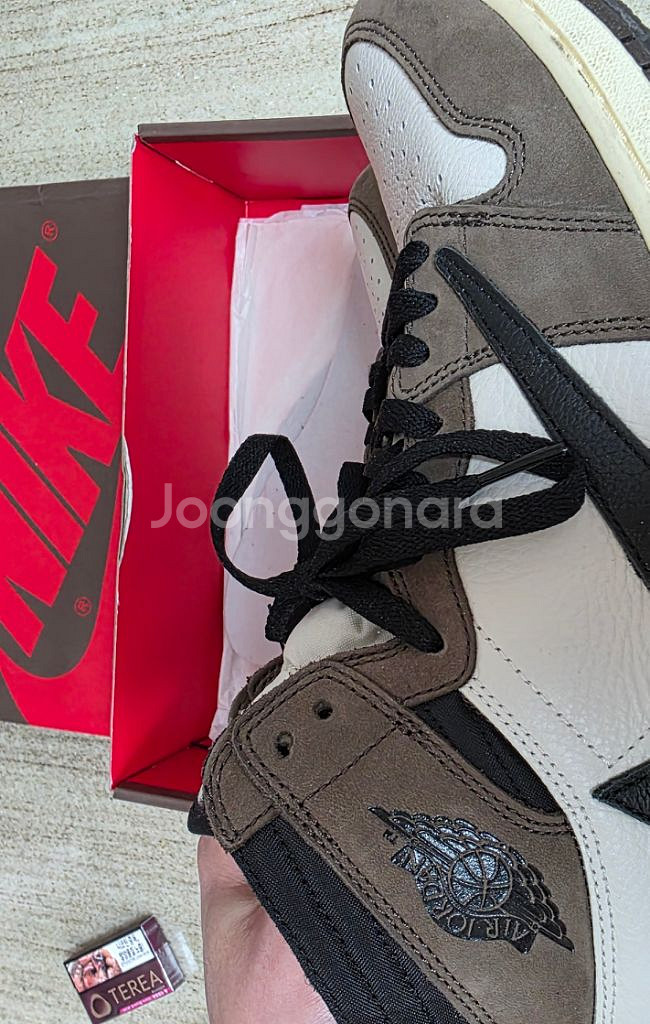개인정보(거래정보)를 주고받는 행위는 사기에 노출될 수 있으므로 즉시 중고나라로 신고해 주세요조던 1 x 트래비스 스캇 레트로 하이 OG 사이즈 280 밑창 보강 2회 착용 깔창 데미지 제외하고 상태 좋습니다