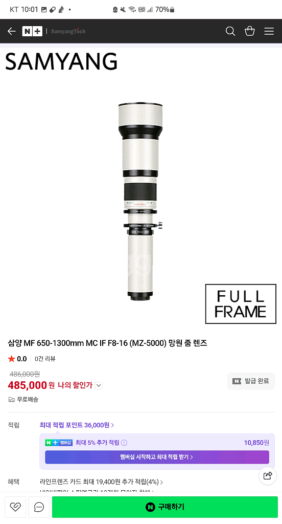 삼양옵틱스의 MZ-5000 650-1300mm F8-16 초망원 줌 렌즈입니다. 풀프레임 DSLR용 수동 초점(MF) 렌즈구요 초점 거리는 650mm에서 1300mm까지 조절 가능하며, 조리개 범위는 F8.0에서 F16입니다. 이 정도의 초점거리는 전세계에서 유일한 제품이라고 하네요.. (대박..) 중국산 oem이 아닌 메이드인 코리아 제품인데 기술력이 어마어마 합니다. 무게는 약 2000g 정도의 무게를 가지고 있구요, T2 마운트를 사용하여 다양한 카메라 마운트 어댑터를 통해 여러 브랜드의 카메라와 호환됩니다. 주로 달 사진 촬영이나 야생 동물 촬영 등 초망원 촬영에 사용된다고 하는데 해외 여행에서 전망대 올라갔을 때 먼 거리에 있는 도시 풍경 사진 같은 걸 찍어도 좋을 것 같아요. 직거래 장소는 남양주입니다. 새상품이지만 박스는 없고 전용 가방에 넣어드린다는 점 유의해 주세요.