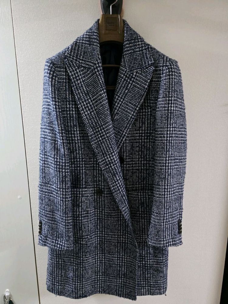 쇼앤텔 코트입니다. 이태리 메이드 네이비x화이트의 매력적인 체크 패턴입니다. 하단까지 이어지는 라펠굴림이 예술입니다. 등판쪽 약간 튿어짐 있어서 저렴히 내놓습니다. 그 외 상태 아주 좋습니다. 46사이즈 어깨 44.5 가슴 52 소매 61 총장 94