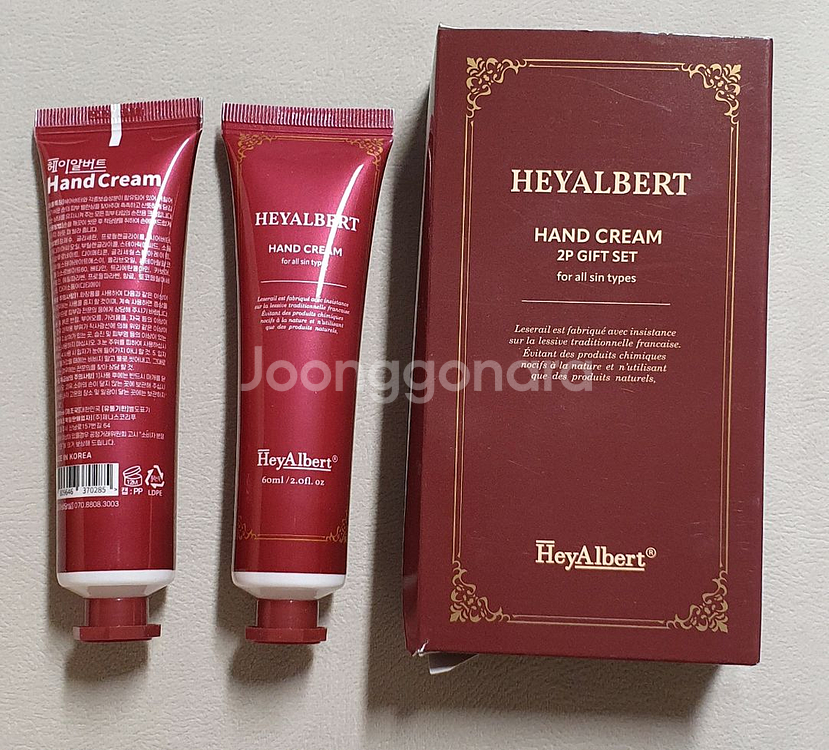 헤이알버트 고보습 핸드크림 2p 세트 새상품 한상자 안에 60ml짜리 핸드크림 2개 들어있어요. 휴대하기도 좋은 사이즈라 가방에 꼭 넣어다니셔야죠.. 시어버터등 보습성분이 함유되어 있어 산뜻하게 당김없이 촉촉함을 유지해줘요. 2개 들어있는거 한상자에 6천원입니다. 1상자 6천원/2상자 12천원 유통기한 2027.9.14일까지라 넉넉해요 반값택배가능 교환불가 환불불가
