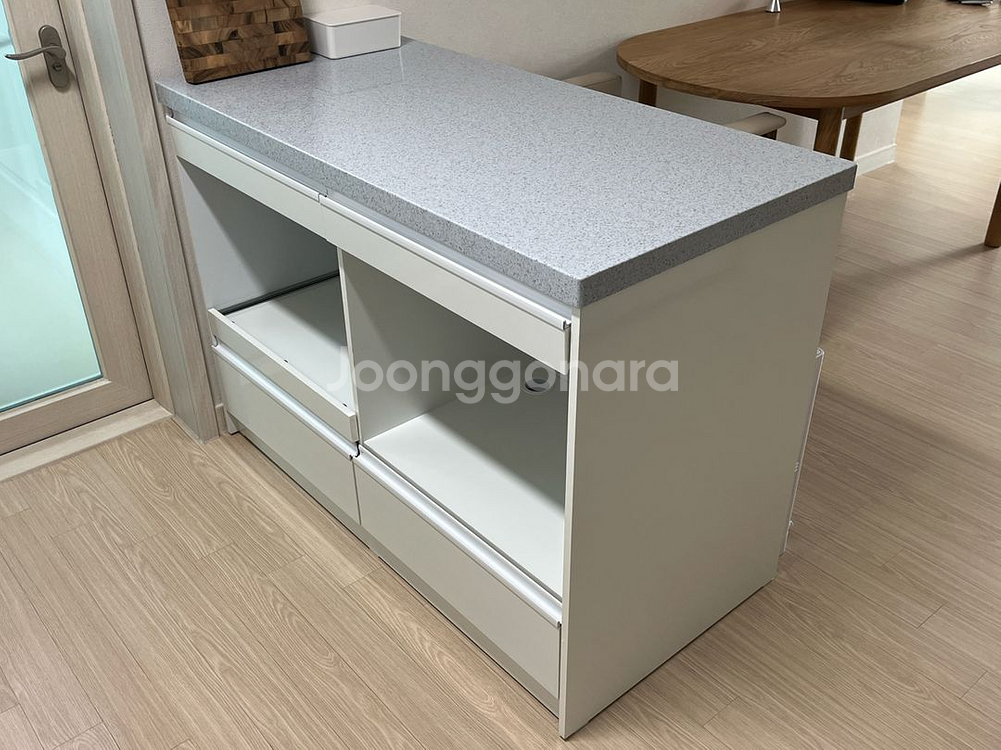 사용을 거의 하지 않은 아일랜드 식탁입니다. 밥솥, 오븐 등 넣어서 사용할 수 있습니다. 사이즈는 사진 확인해주세요! 브랜드명 : 퍼치스 색상 : 화이트 상판 : 인조대리석 (회색) 구매가격 : 36만원 거래희망 장소 : DMC두산위브더퍼스트