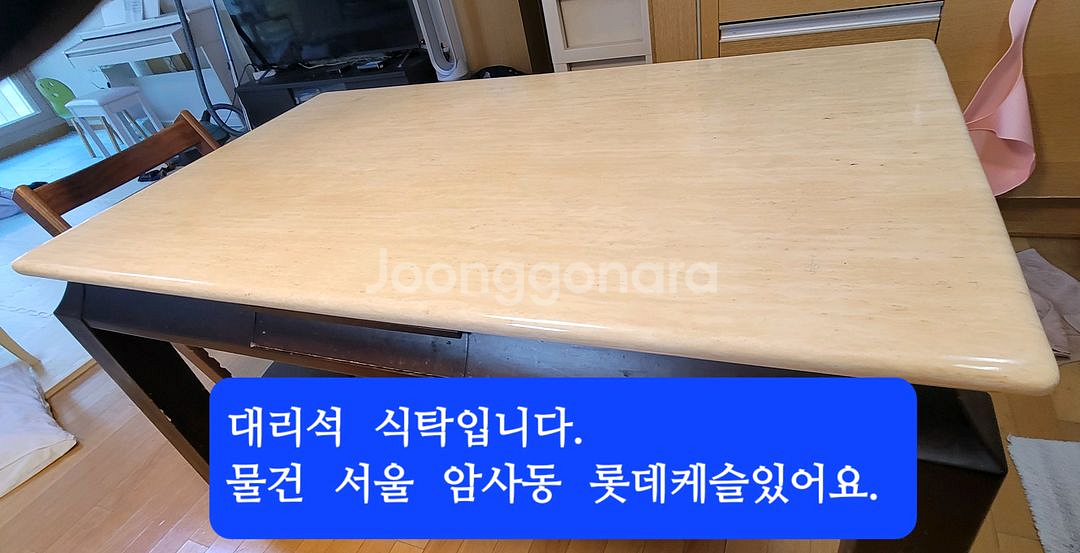 대리석 상판의 고급스러운 식탁이에요. 서울 암사동 롯데케슬에서 구매한 제품으로 상태 양호합니다. 깔끔하고 세련된 디자인으로 어떤 인테리어에도 잘 어울려요.