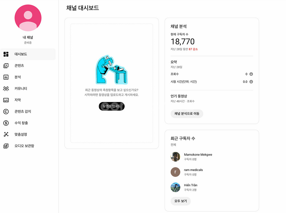유튜브 채널팝니다 해외구독자 18770명 보유중 수익 미승인 채널이며 콘텐츠 업로드 해가면서 수익승인 받으셔야합니다 가격은 에누리 가능합니다 문의 톡 주세요~ :)