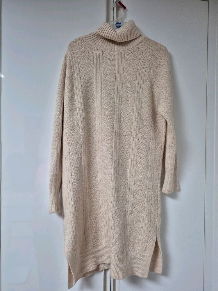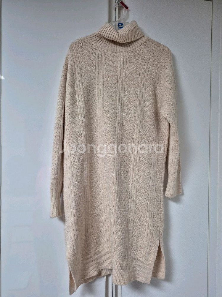 77사이즈 롱 니트 원피스입니다. 색상은 은은한 아이보리 색상이고, 톡톡한 니트 재질이라 따뜻합니다. 옆에 트임 있어서 활동하기 편하고, 레깅스랑 코디해서 입기 좋습니다. 77사이즈 레깅스에입기도좋고 톡톡한니트예요