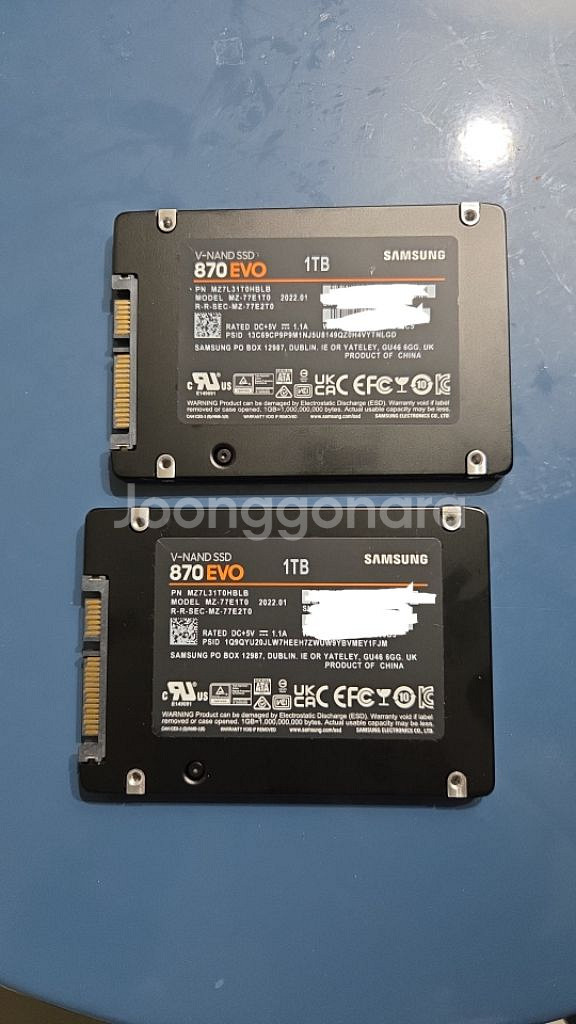 삼성 SSD 870 EVO 1TB 대용량 SSD입니다. 외관 상태 양호하고 정상 작동하는 제품이에요. 고성능 저장장치로 컴퓨터 업그레이드나 새 구축용으로 좋습니다. 백업용으로만 사용해서 사용빈도 적습니다. 22년 1월 제품 개당 9만원, 2개 있습니다. 일괄시 택포