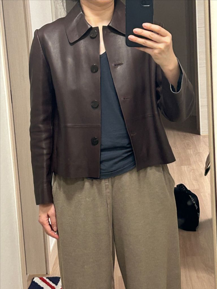 롯데인천백화점구매.55사이즈 고급스럽고부드러운가죽이며 160만원정도주고산옷입니다.3번착용해서 거의새옷같으실겁니다.고급스런버건디색입니다.