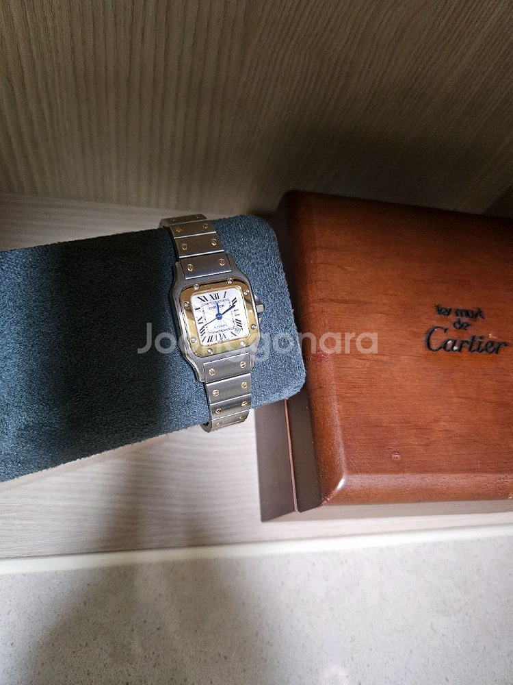 Cartier Santos2423 클래식 콤비 사이즈 약23~24mm 오토매틱, 날짜창, 스크래치방지 사파이어크리스탈, 생활방수30m, 로만인덱스, 5시방향 날짜창(산토스 연식별로 날짜창 위치가 다른데 5시방향 마지막버전), 버클은 양쪽에서 열고 닫는 양방향 접이식 체결방식으로 쉬운탈착과 노출없이 팔찌처럼 매끄럽게 연결.. 홍콩에서 여행중 현지 지인 소개로 구매했고 디테일 잘 만들어진 이미 제품입니다. 구성품은 본품, 까르띠에 보관용 원목케이스, 베개, 천. 시간 잘 맞고 정상작동, 자주 사용한 제품 아니라서 전체적으로 심한 스크레치 없이 미세생활사용감만 약간 있습니다. 글라스 스크레치는 없습니다. 한번도 밴드길이를 줄이지 않고 옷소매 위에 착용해서 남성손목에도 넉넉한 사이즈 상태라서 줄여서 착용하심 됩니다. 사진 확대 디테일 확인해주세요.(40mm남성시계 크기비교 마지막사진) 혹시 부족한 정보는 까르띠에 산토스2423으로 검색.