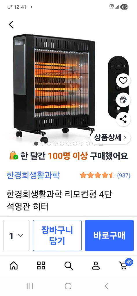 한경희생활과학 리모컨형 석영관히터예요. 한 철만 써서 상태에 아주 세거대비 90%고요. 깨끗합니다
