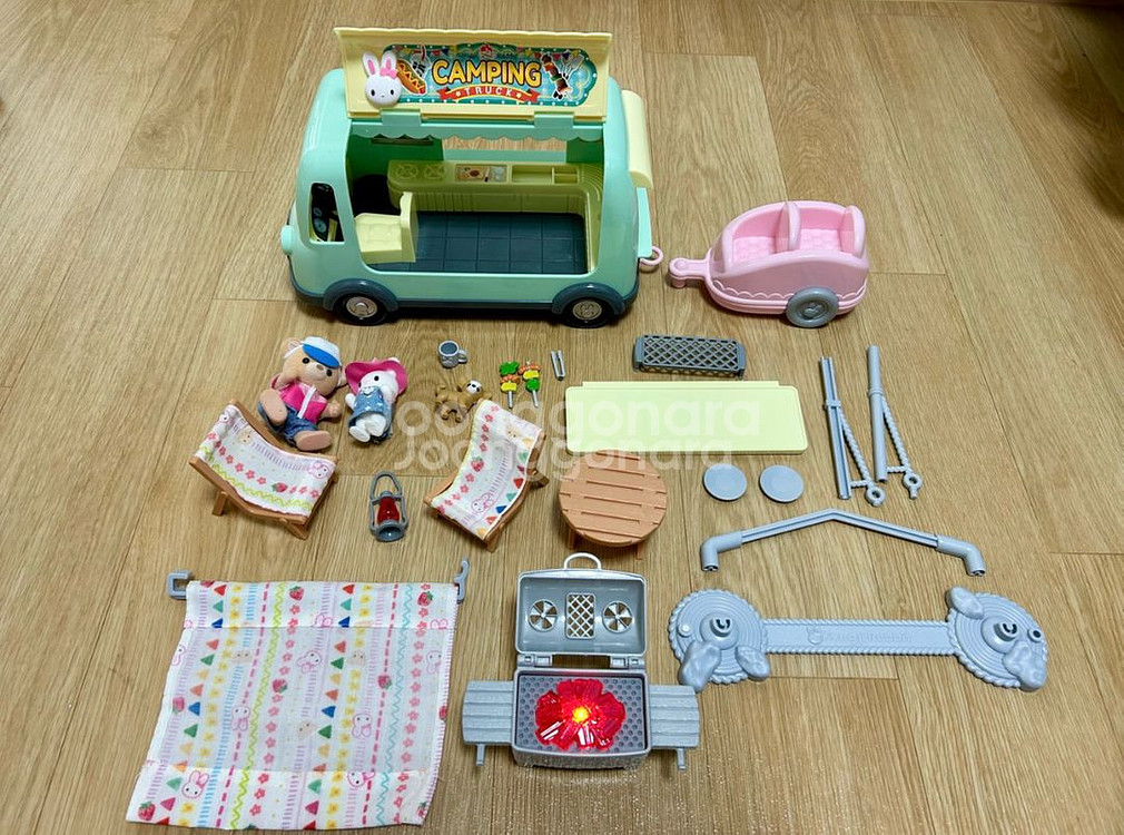 콩지래빗 캠핑카 캠핑카와 트레일러, 인형 2개, 캠핑 의자 2개, 테이블, 바베큐 그릴 등 다양한 캠핑 액세서리가 포함되어 있습니다. 아이들이 역할 놀이하며 즐거운 시간을 보낼 수 있습니다. 원래 구성에서 분실된 것 없어요. 집게는 부러져서 글루건으로 붙였어요. 장작불 건전지 있고, 정상 작동해요. 원하시면 추가 상세사진 찍어드려요~ 택포금액!!