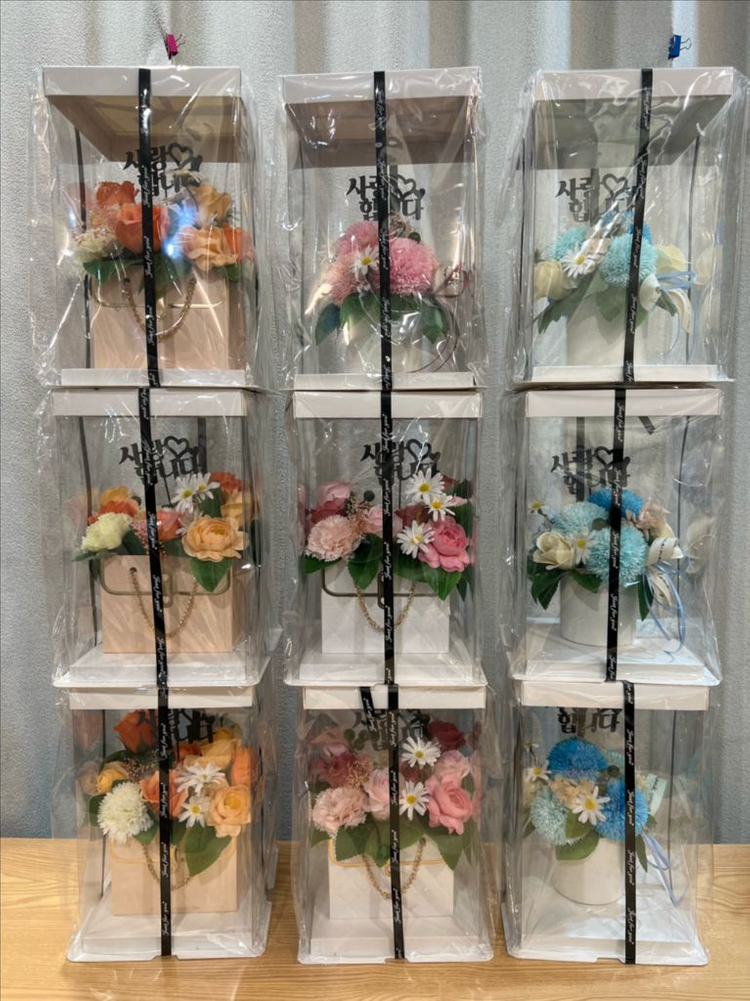 선물용으로 좋은 비누 꽃 세트입니다 다양한 색상의 꽃들이 예쁜 케이스에 담겨 있습니다 특별한 날, 감사의 마음을 전하기에 좋습니다 높이 28 센티 , 가로세로 17.5 센티 1개 28,000 원 일반택배 4,000 원 반값택배 2,000 원