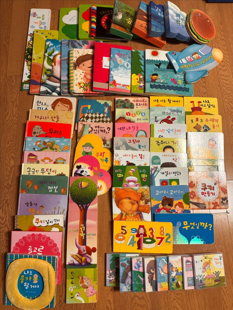 아가월드 MIT 책입니다. 책에 따라 사용감차이 있습니다. (안아주세요, 아가야사랑해, 맛있는햄버거 이 세권은 너덜너덜한 상태입니다. 다른책 상태는 좋습니다) 스폰지?재질책부터 퍼즐북, 입체북, 촉감책, 향기책, 거울책 다양합니다. 사진 맨 아래부분에 책을 노래로 만든 CD 8장 있습니다. 노래먼저 듣다가 책으로 넘어가면 더 잘봅니다.
