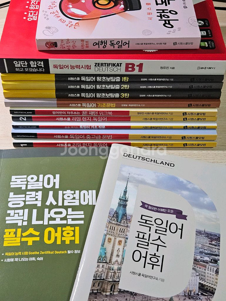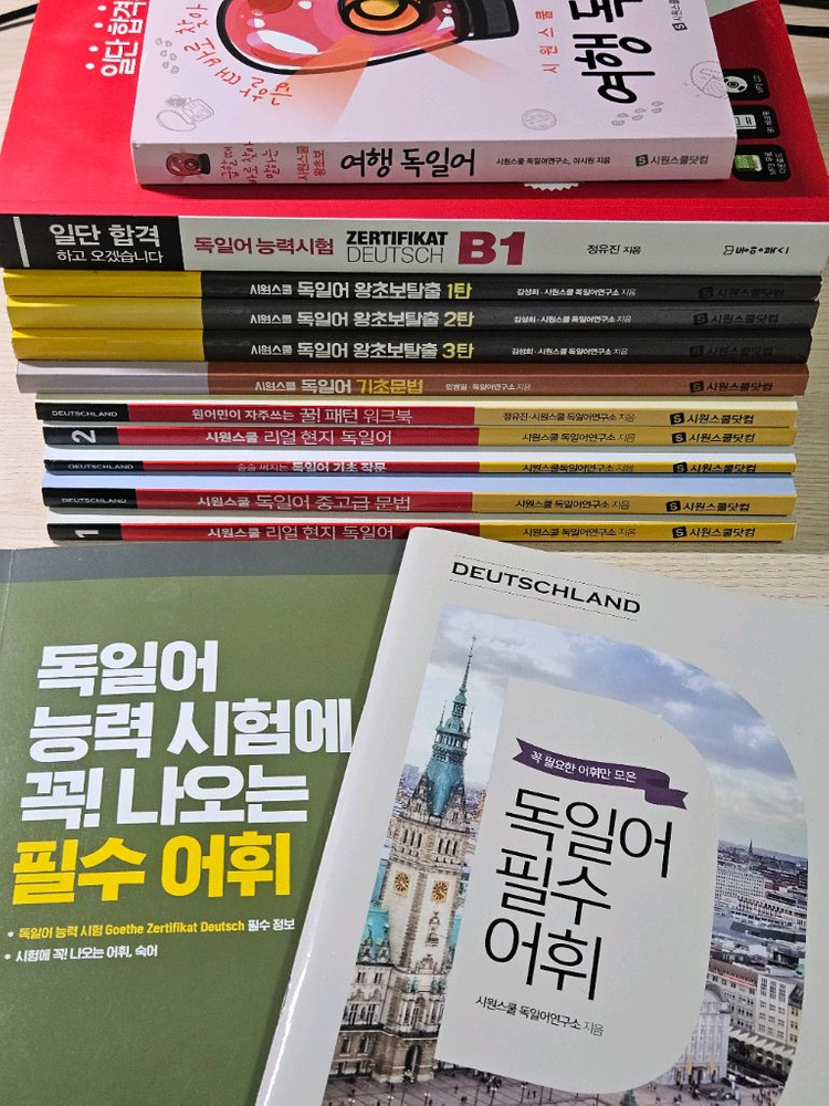 시원스쿨 독일어 교재 13종 팝니다. 사진과 같이 2종은 일부 필기 있습니다. 그 외 11종 새상품입니다. 택배 포함 4.2만원 <교재 구성> 독일어 왕초보 탈출 1탄 (필기있음, ~2과) 독일어 왕초보 탈출 2탄 독일어 왕초보 탈출 3탄 독일어 기초 문법 독일어 중고급 문법 원어민이 자주쓰는 꿀 패턴 워크북 리얼 현지 독일어 1 리얼 현지 독일어 2 술술 써지는 독일어 기초 작문 여행 독일어 꼭 필요한 어휘만 모은 독일어 필수 어휘 독일어 능력 시험에 꼭 나오는 필수 어휘 (필기 있음) 독일어 능력시험 B1