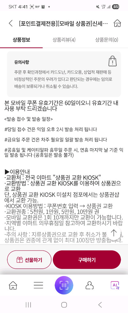 신세계에서 사용 가능한 40만원 모바일 상품권 입니다! 라이프케어에서 수신자 설정해서 보내드립니다! 구매시 다음날 2시에 문자로 발송됩니다!